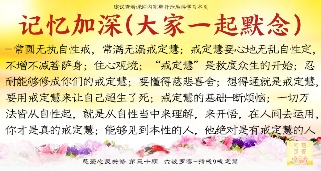 经常把事情都想得圆满一点,不要去执着,自己的本性要学会守戒。比方说,你已经想好了的事情,别人跑过来跟你反着讲、跟你唱反调,你不要去执着,所以叫常常的圆满之心,没有执着,学会守戒。常满无漏戒定慧,经常圆满的思维,你才会无漏,也就是说,你今天不让任何一点不好的东西玷污你的思维,那你就是在修戒定慧三无漏学。